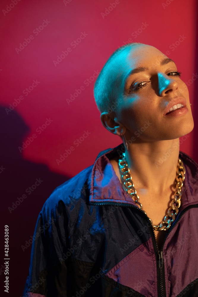 Woman with makeup and short hair in fashionable clothes looking at the camera