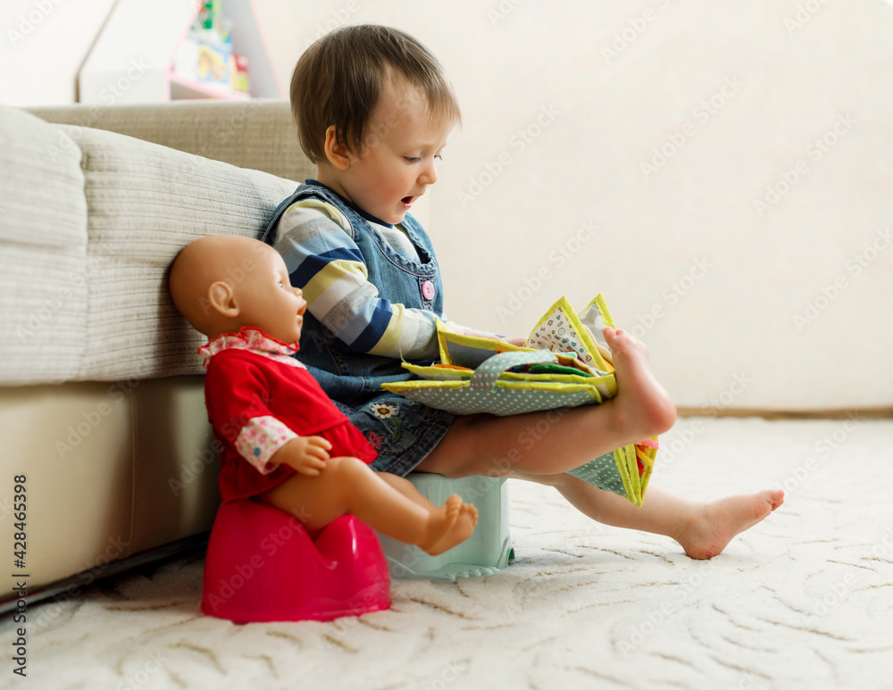 Toilet training concept. Closeup of cute little toddler baby girl child sitting on potty. Kid playing with doll toy. Baby learning, development steps