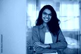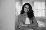Portrait of smiling African American business woman wearing stylish eyeglasses looking at camera standing in modern office. Successful business and career concept