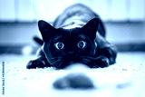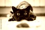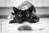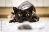 Cat hunting to mouse at home, Burmese cat face before attack, funny pet close-up, concept of kitten, play, predator, pounce.