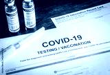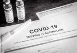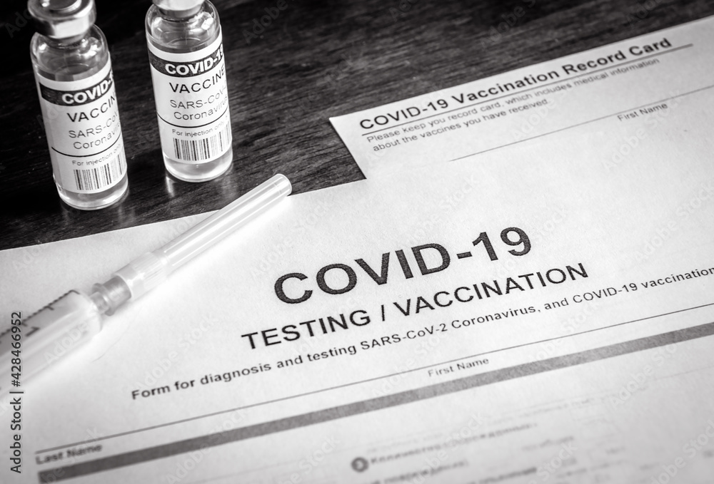 COVID-19 test and vaccine medical form on desk in clinic, BW photo