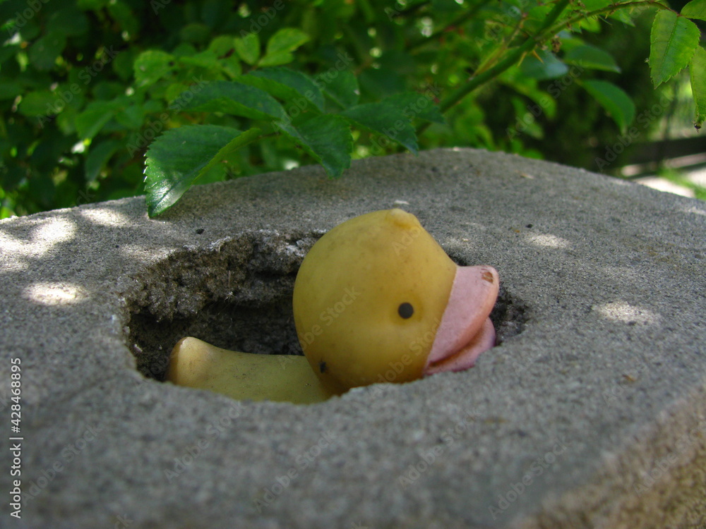 Brudna wyrzucona dziecięca zabawka do kąpieli żółta kaczka na asfalcie