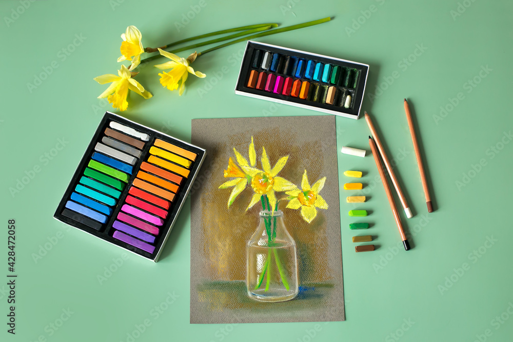 Soft pastel painting of daffodils, set of colored pastel and pencils