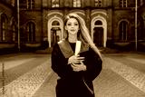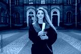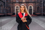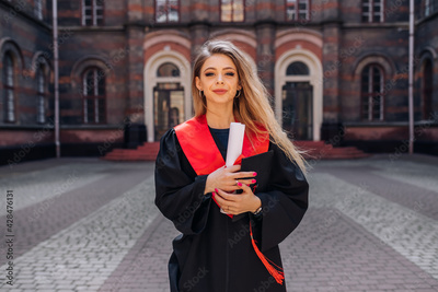 happy graduate student in a graduation gown stands with a diploma, against the background of the university.