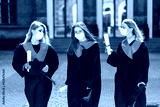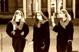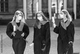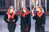 Last meeting. Happy graduates in prom dresses walk outside wearing protective masks and talk about their plans for the future.
