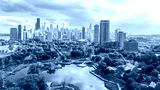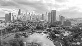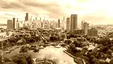 Chicago skyline aerial drone view from above, lake Michigan and city of Chicago downtown skyscrapers cityscape bird's view from park, Illinois, USA