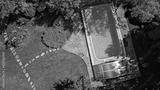 Swimming pool in beautiful garden aerial top view