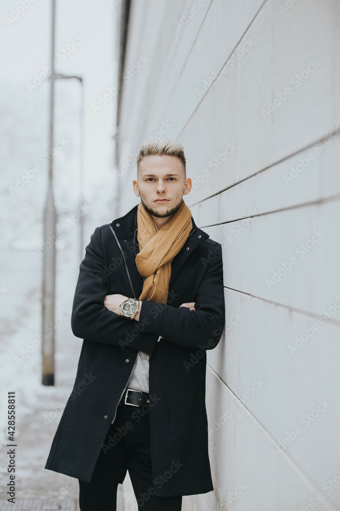 Handsome man in a black winter outfit with a brown scarf leaning against a wall with hands crossed