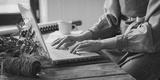 Female designer florist freelancer working online hands-free keyboard, remote work e-learning, accept and receive orders online interent
