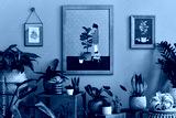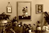 Stylish botany composition of home garden interior with wooden mock up poster frame, filled a lot of beautiful house plants, cacti, succulents in different design pots and floral accessories. Template