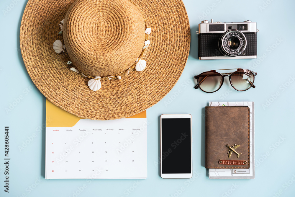 Empty screen smart phone with travel items on color background with copy space, Vacation planning concept