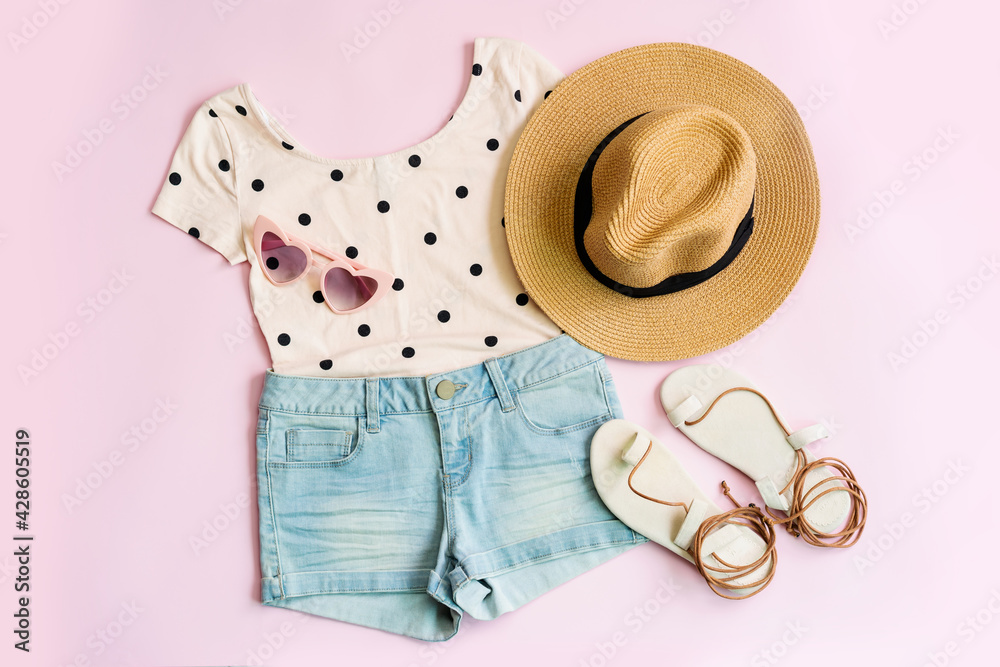 Fashion summer women's clothes set with accessories on pink background, Flat lay, Top view