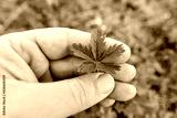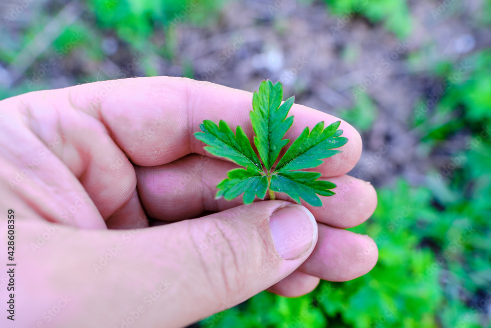 Young leaves of a special kind of hemp in a man's hand, fresh leaves in spring.