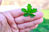 Young leaves of a special kind of hemp in a man's hand, fresh leaves in spring.
