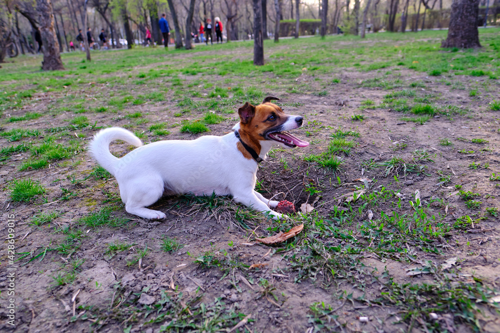 Funny dog jack russell terrier breed plays in the park in spring.