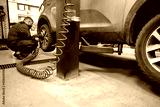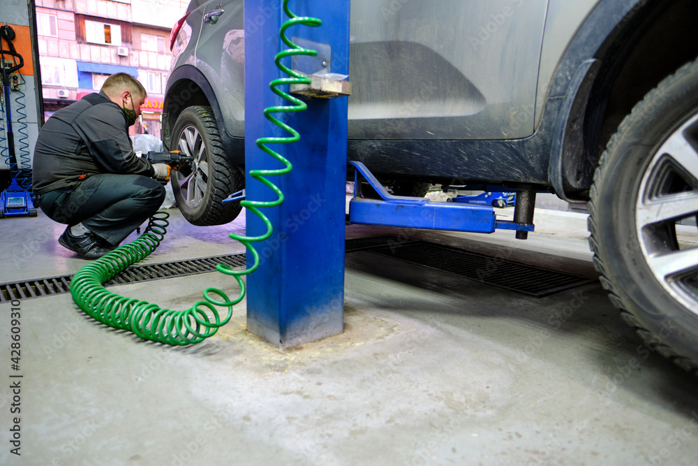A mechanic uses a pneumatic wrench to change wheels in a tire replacement service center.