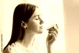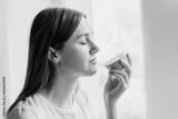 Loss of smell concept. Caucasian young woman stands near the window and sniffs an orange