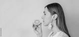 Loss of smell long banner. Caucasian young woman in a medical mask sniffing an orange on a white background in the studio. profile view