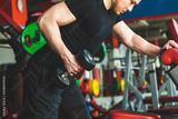 young male athlete performs exercises in the gym with dumbbells. Endurance Strength Training