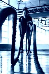 Crossfit with ropes. The athlete is training in the gym opposite large panoramic windows.