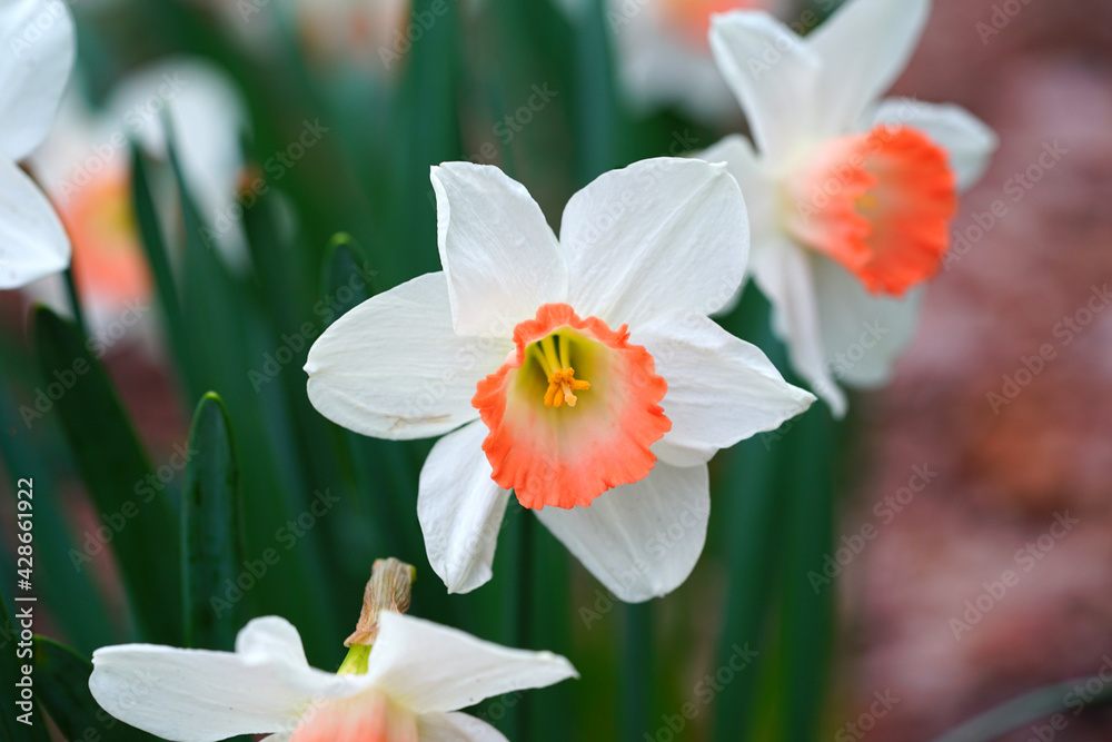 Yellow and orange narcissus daffodil flowers growing in the garden