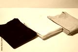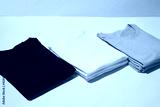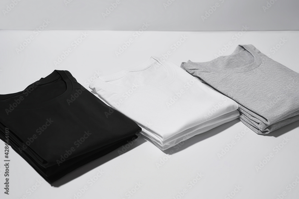 Three folded monochrome t shirts gray, black and white isolated over gray background