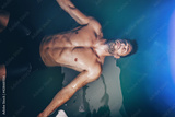 Handsome beard man floating in tank filled with dense salt water used in meditation, therapy, and alternative medicine.