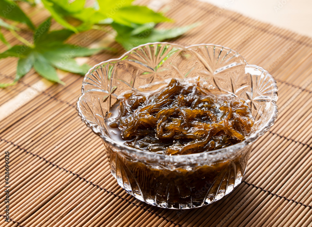 Mozuku placed on a bamboo wanchong mat. The image of Japanese food.
