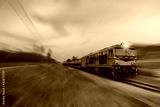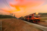 Fast speed motion cargo train on railway with twilight sun sky background.