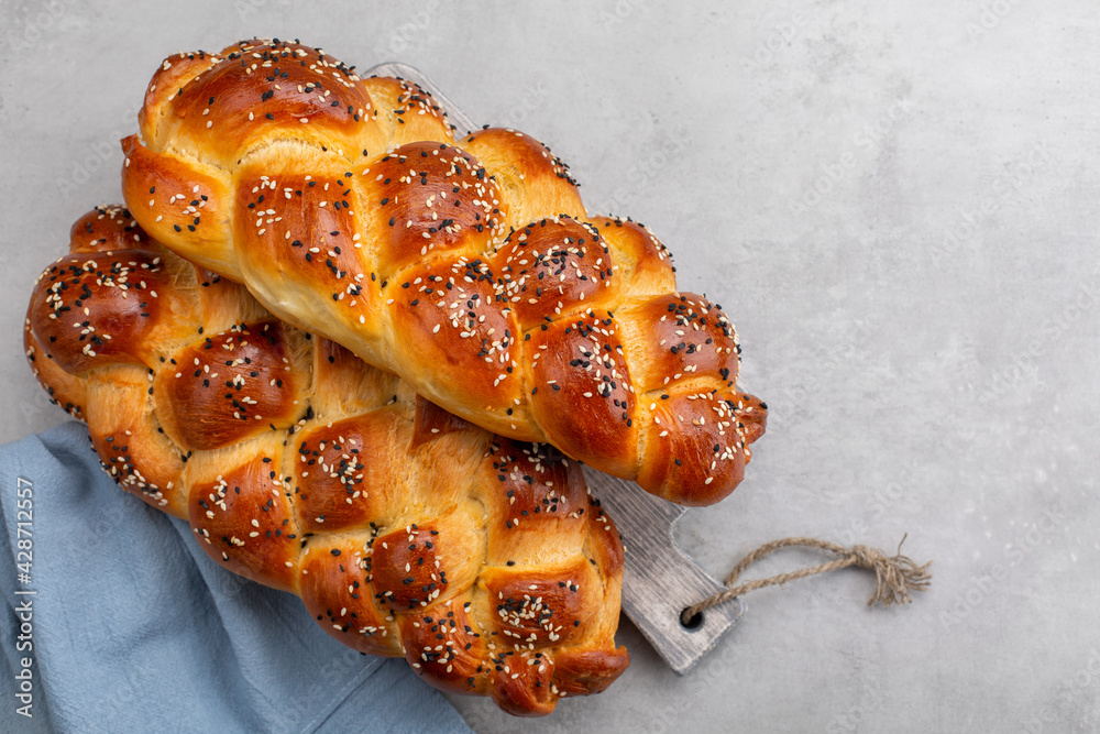 Homemade braided Challah bread decorated with sesame seeds. Top view. Light grey background. Copy space.