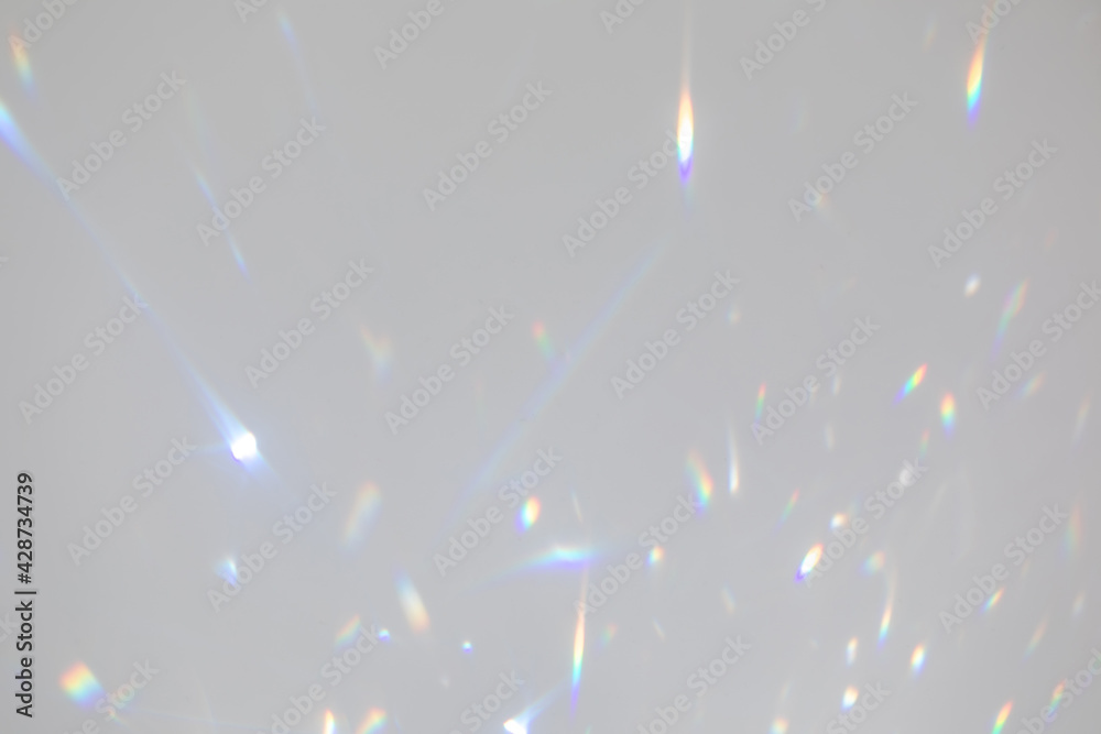 Blurred rainbow light refraction texture overlay effect for photo and mockups. Organic drop diagonal holographic flare on a white wall. Shadows for natural light effects