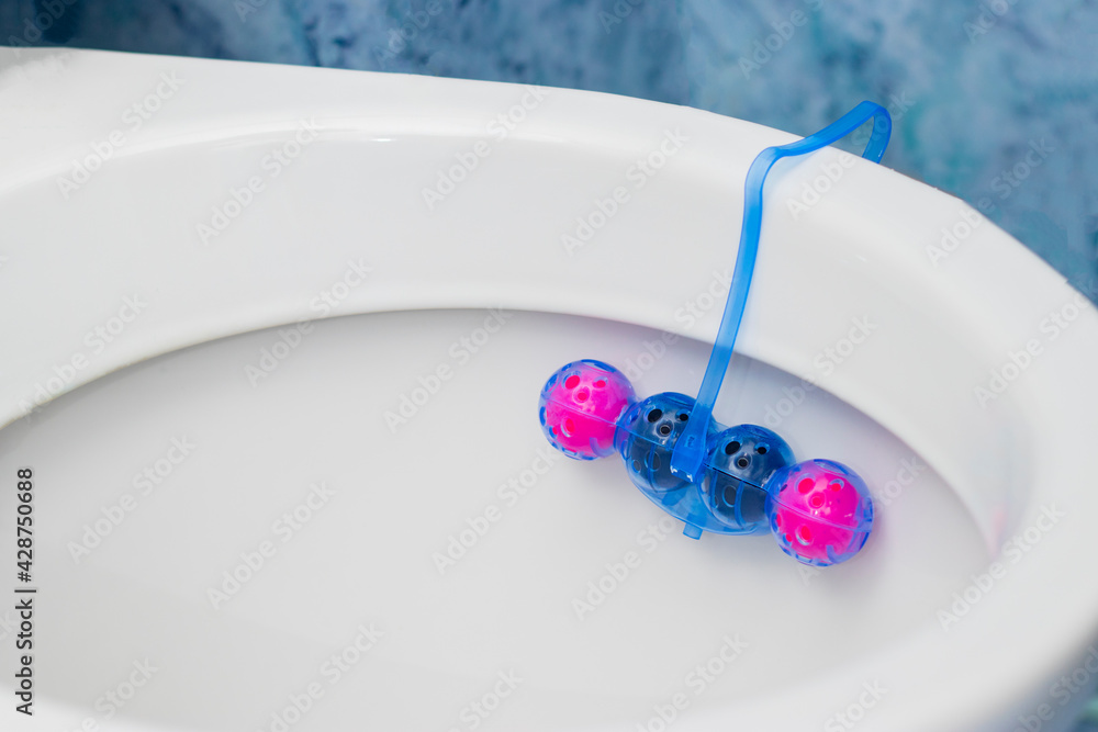 Clean toilet bowl with a cleaning and refreshing balls. Multi-colored balls of toilet bowl cleaner