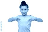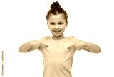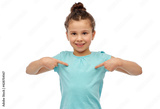 childhood, fashion and people concept - happy smiling girl pointing fingers to herself over white background