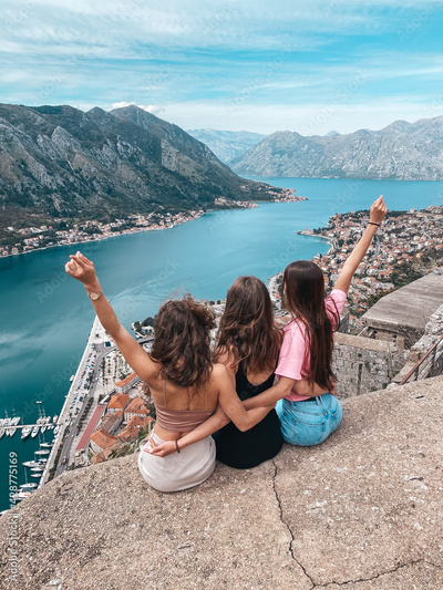 Back view of three best friends sitting on a mountain and travelling and looking at sea