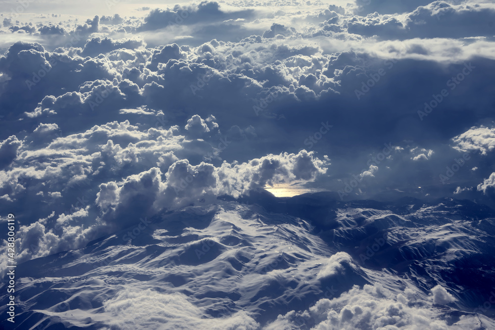 View from a high altitude on the clouds and the earth, the movement of air masses. Concept: God's view of the earth, the view from the plane window.