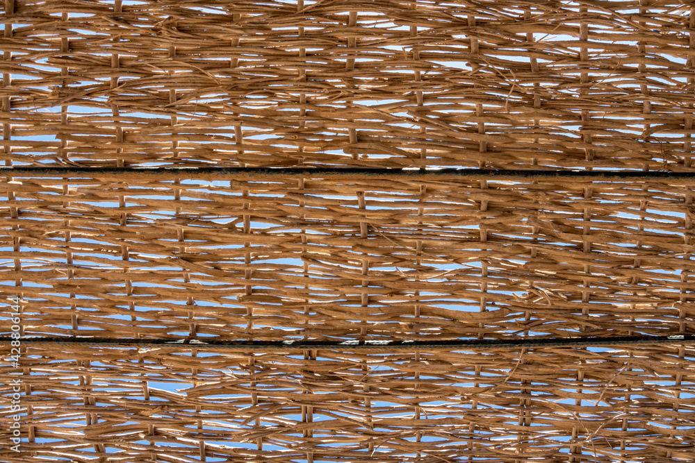 A fragment of a wicker wooden canopy from the sun made of branches, a beach umbrella for vacationers at a seaside resort.