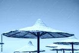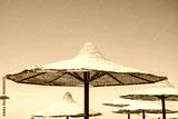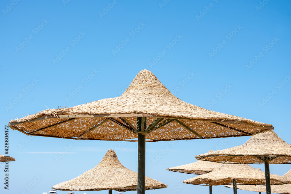Wicker umbrellas made of wooden rods for vacationers on a deserted beach against the backdrop of a seascape.