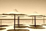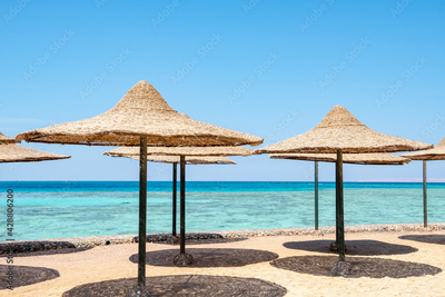 Wicker umbrellas made of wooden rods for vacationers on the beach against the backdrop of the seascape.