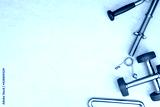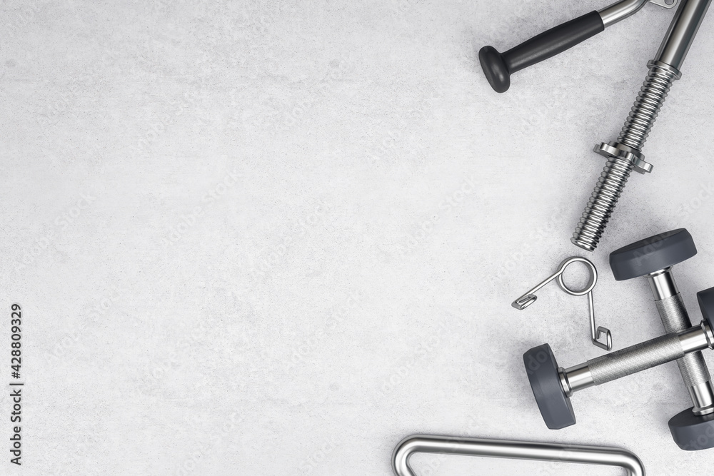 Fitness workout concept with sport equipment on light blank concrete floor. 3D rendering, mockup