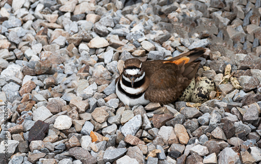 Killdeer plover sitting next to her eggs in a bed of rocks