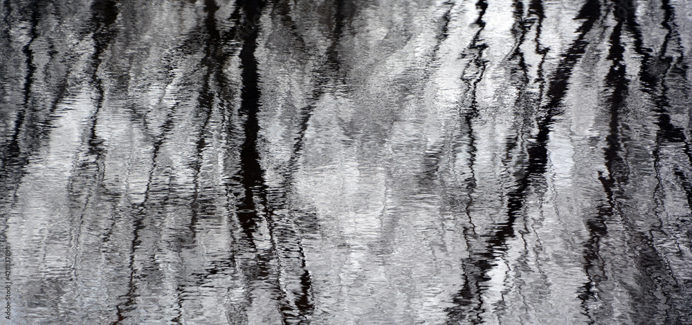 Blur reflection of trees in lake water on a spring cloudy day
