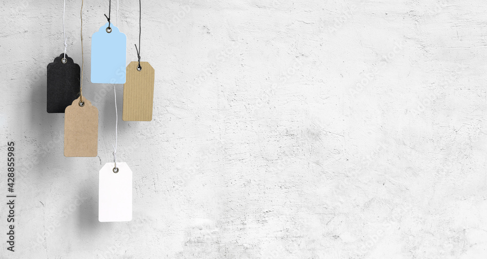 Blank cardboard price tags tied with rope on white wall background