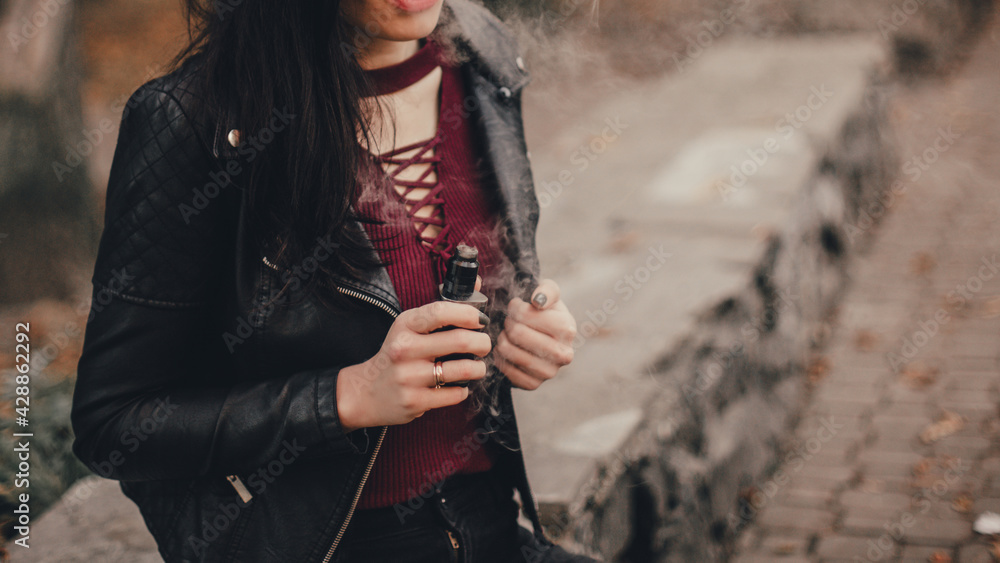 Beautiful stylish brunette smoking an e-cigarette as she is walkind through park. Vaping concept. Trendy new vaping device, smoke e-liquid instead of nicotine cigarettes.