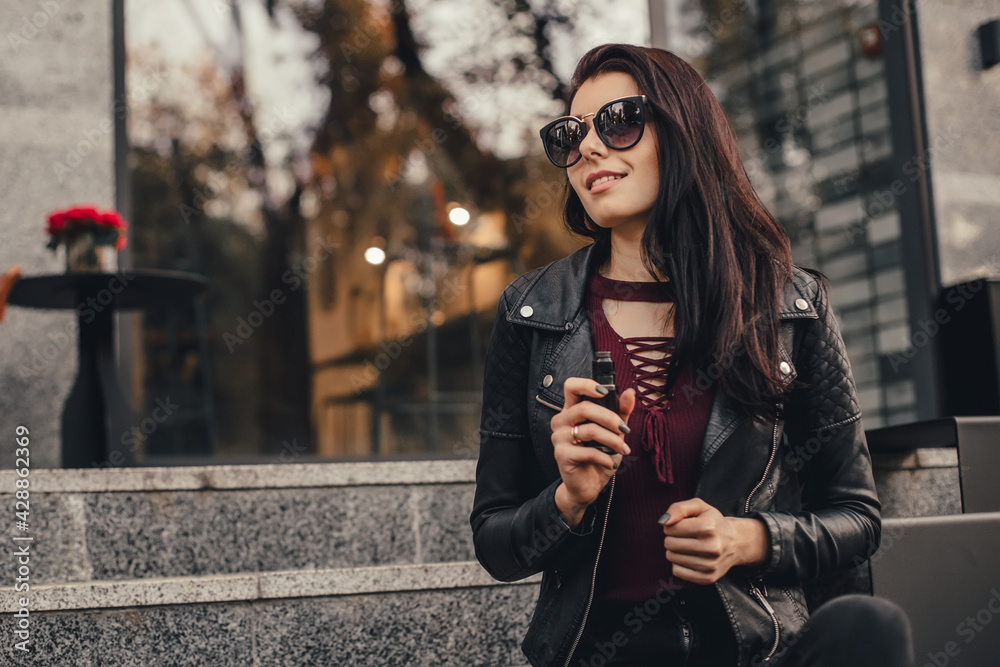 Beautiful stylish brunette with e-cigarette. Vaping concept.