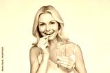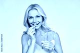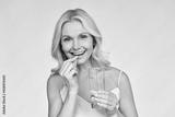 Happy middle aged 50s woman holding pill and glass of water taking dietary supplements. Portrait of smiling adult attractive woman taking care of health in menopause, isolated on white.
