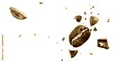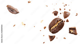 Close-up of roasted beans flying in the air among ground coffee on white background. Concepts of levitation. The crash coffee shatters into pieces.