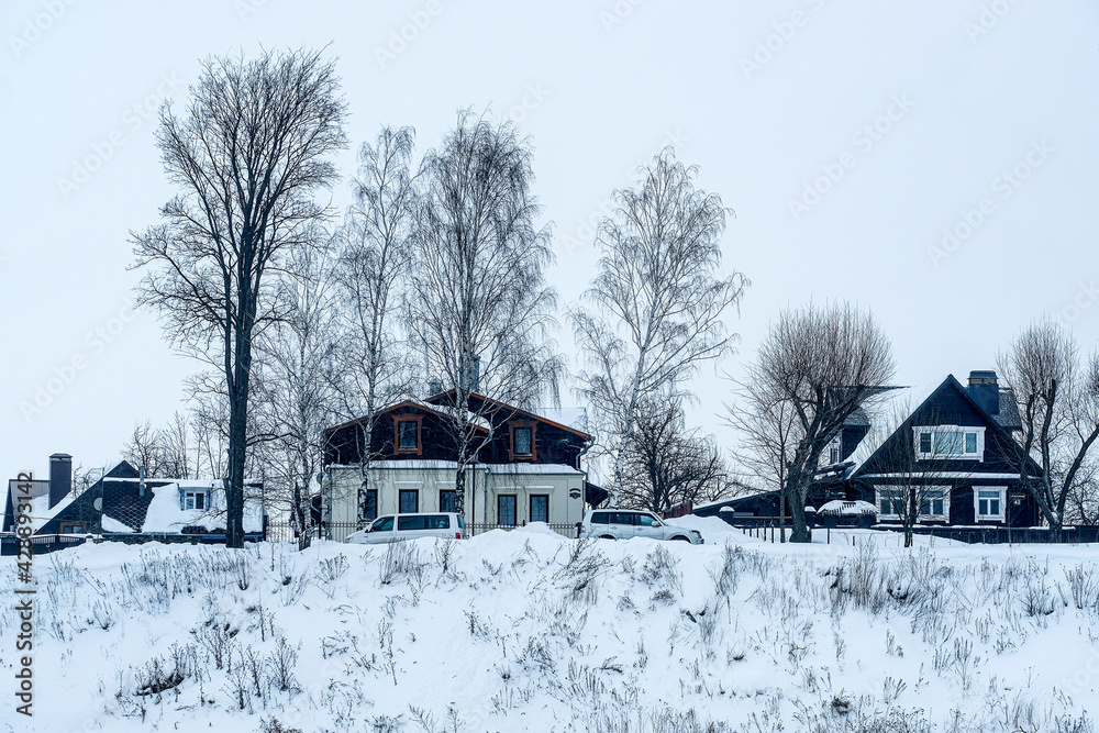 Suzdal, Russia - February, 22, 2021: Winter landscape with the image of old russian town Suzdal