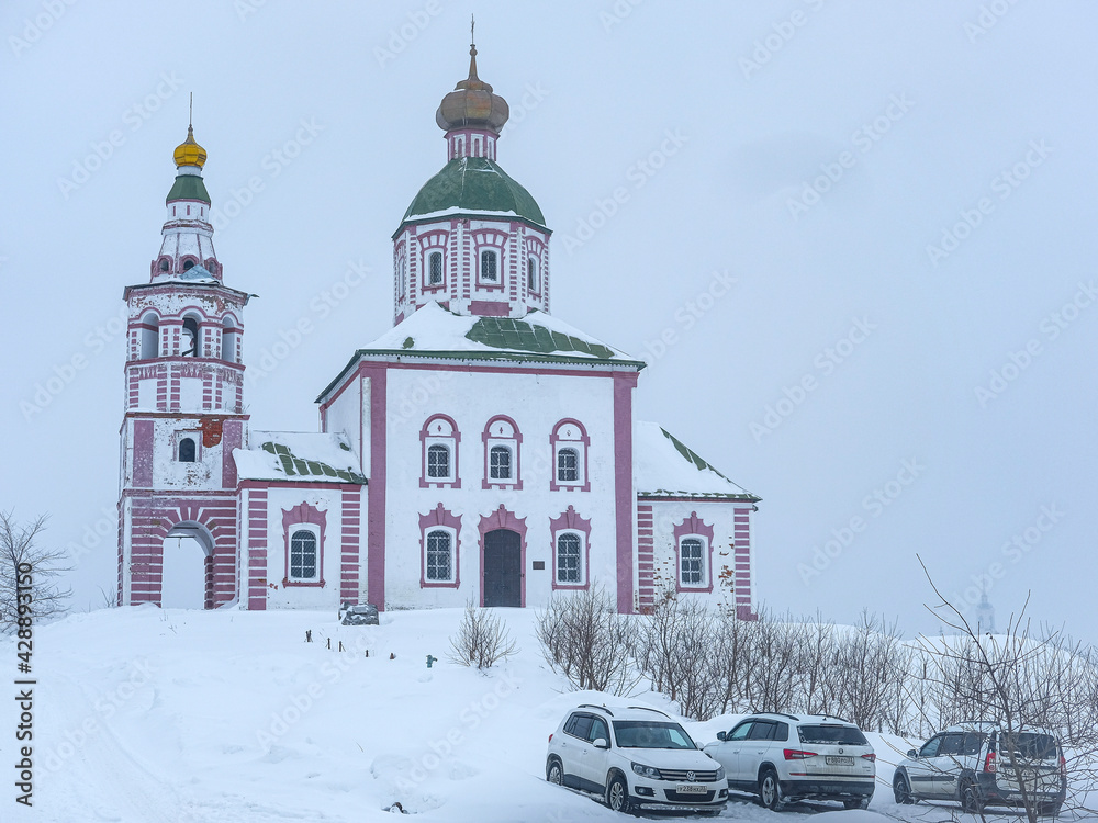 Suzdal, Russia - February, 22, 2021: Winter landscape with the image of old russian town Suzdal