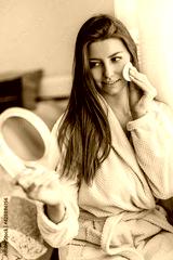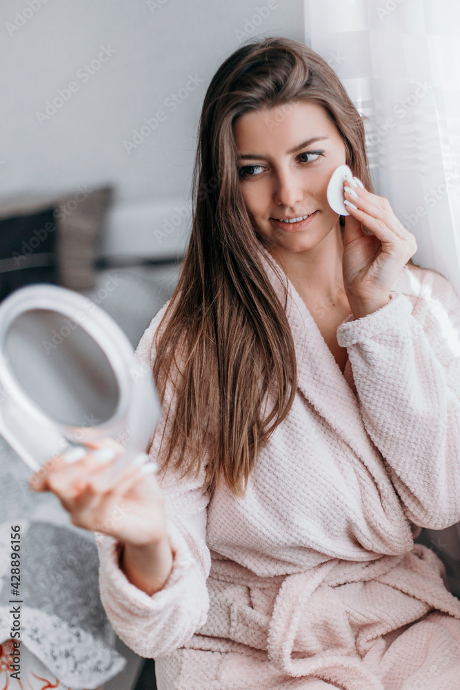 Woman relaxes after bath procedures and cares for face skin in his room. Morning skin care routine. Stay at home while quarantined to avoid coronavirus.