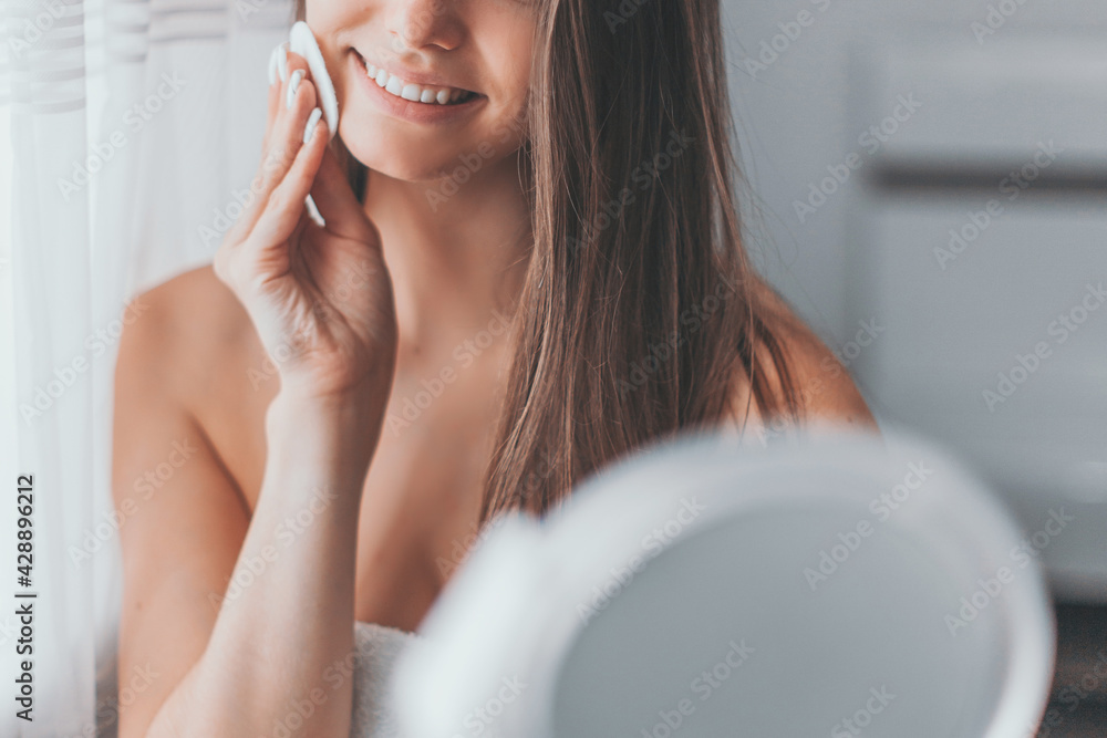 Woman relaxes after bath procedures and cares for face skin in his room. Morning skin care routine. Stay at home while quarantined to avoid coronavirus.